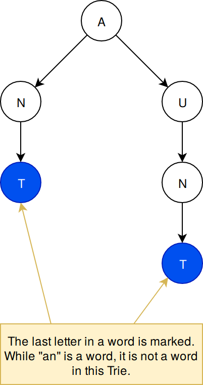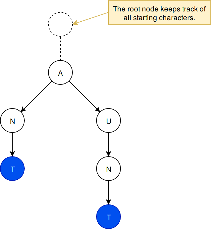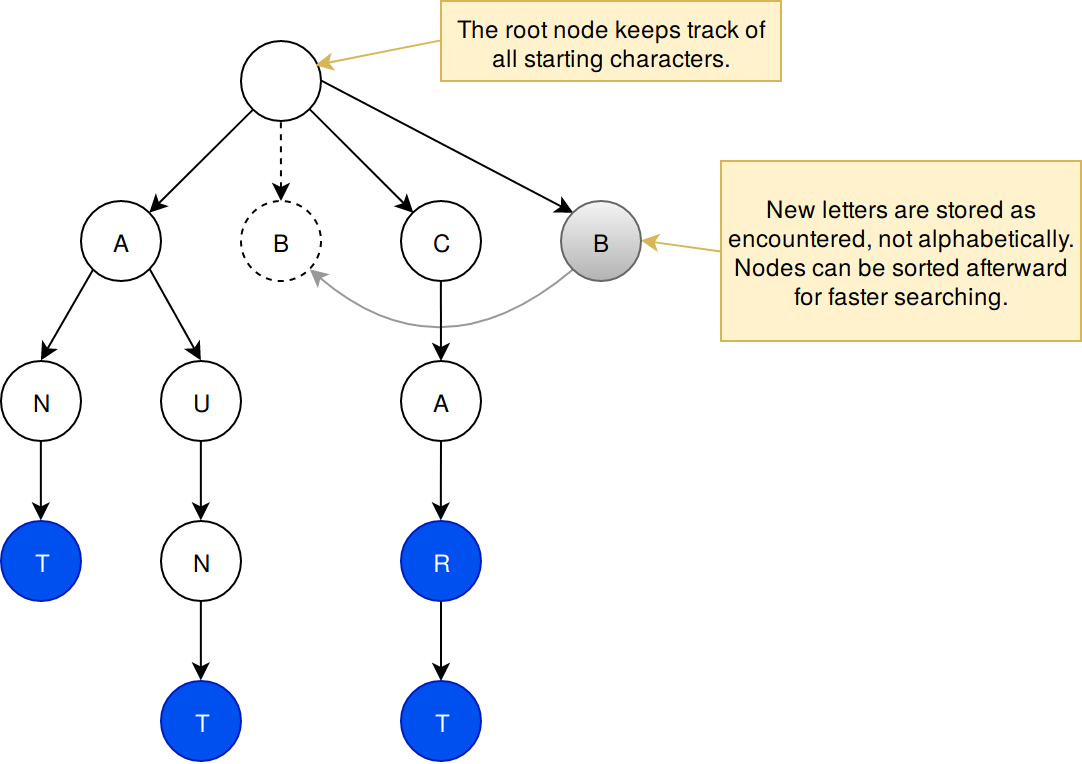 For example, the words “ant” and “aunt” share the same first letter, ‘a’, which is their common predecessor. As each letter in the string [a, n, t] is read, it is added as a new node. Each subsequent letter is connected to the previous letter, forming a path along the branches. When adding the second string, [a, u, n, t], the process starts over from the root node and each node is checked to see if the letter’s node already exists. Since the ‘a’ node already exists as the top level node, it is traversed, and the next character is read from the input string. If the letter is not identified, it is added as a new node, creating a new branch.